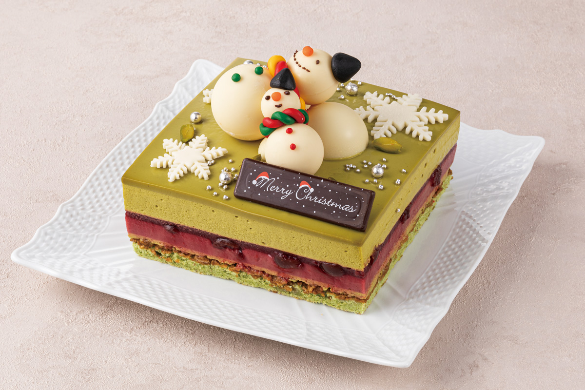 キルシュ香るグリオットゼリーとグリオットムースを相性の良いライチ風味のピスタチオムースで挟みこみ、下にはサクサク生地をひいた5層仕立て。食べやすく優しい一品に仕上げました。